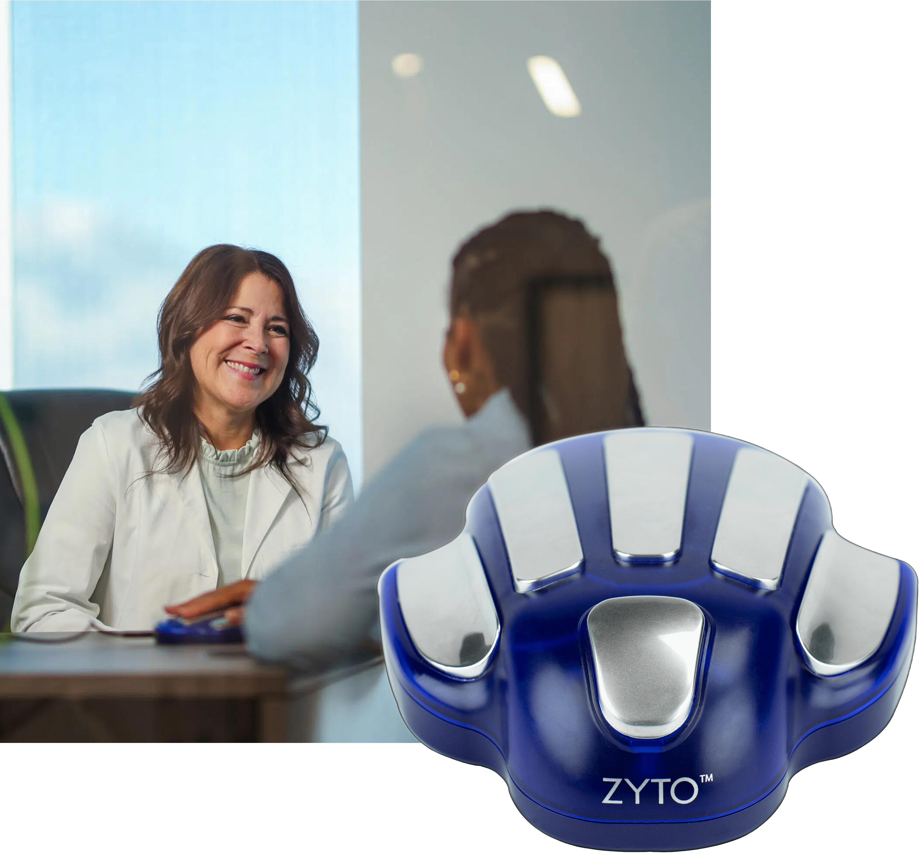 A ZYTO Balance Health Scan is a non-invasive wellness scan that uses galvanic skin response (GSR) data collected through the ZYTO Hand Cradle to evaluate how your body responds to subtle energetic stimuli.